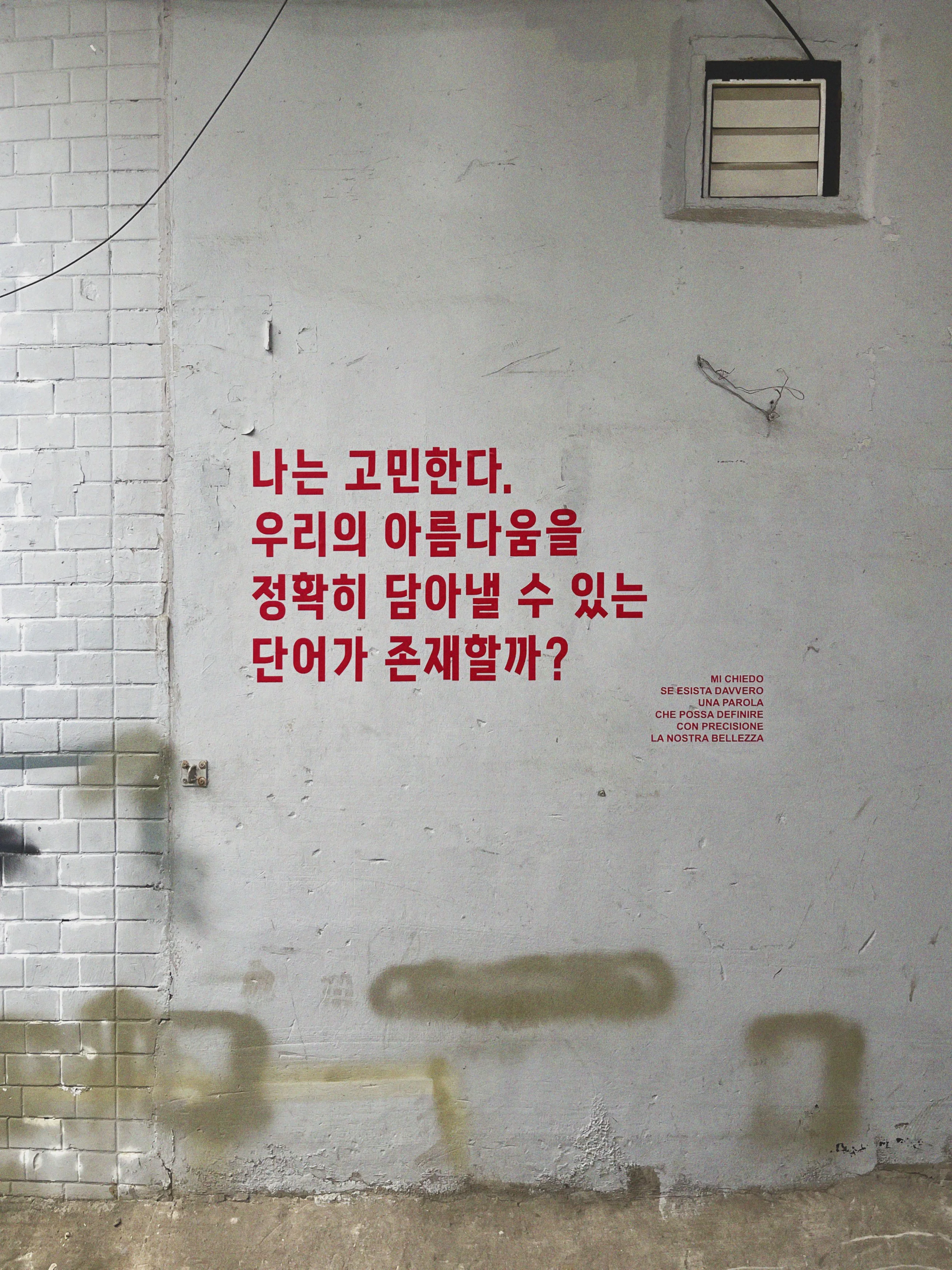 Ogni tentativo di interpretare una lingua differente dalla propria è un incontro-scontro: agli occhi dello straniero, la trasparente chiarezza dello strumento linguistico si converte in fitta opacità; il ricorso alla traduzione è dunque essenziale, ma genera – inevitabilmente – nervosi equivoci, immagini alterate, silenzi insoddisfatti. Eppure questo sforzo decifratorio, pur così frustrato, accende un movimento di pensiero che, proprio nel conflitto che produce, concede una straordinaria occasione di incontro: non è infatti la traduzione l’approdo finale, ma il processo di giudizio che si è attivato. Torrisi tenta di avvicinarsi alla cultura coreana ma, agli occhi di un occidentale, la lingua di quel popolo appare un singolare mosaico di segni informi e confusi. Nel corso delle sue ricerche, comprende, tramite una traduzione estemporanea, che una sezione di un sito coreano in difesa dei diritti LGBTQI+ contiene storie di coming out. Ne è attratto e incuriosito. Si affida a un attendibile programma di traduzione e dà a quei segni inaccessibili una veste familiare. La restituzione in italiano è, in molti punti, prevedibilmente inadeguata, ma, nel suo senso complessivo, è in grado di schiudergli quell’incanto che aspettava. Così quel senso di estraneazione linguistica e più genericamente culturale cede improvvisamente il passo a un bisogno - tumultuoso e delicato al contempo - di immergersi nelle travagliate storie interiori dei protagonisti, di condividerne l’esperienza dello scacco e della redenzione, di partecipare della loro tensione verso un altrove che salvi. E dall’urgenza di conoscere per parlarne Torrisi matura il passo successivo: parlarne, pur da occidentale, pur da italiano, per conoscere e riconoscere, in quei vissuti particolari, slanci, aspirazioni, desideri inequivocabilmente umani, innegabilmente universali, esito a cui tende in tutti i suoi lavori. Le parole di cui dispone per parlarne sono però ancora ingabbiate in una traduzione imprecisa, pertanto decide di riordinarne alcuni elementi, accorcia, ricompone, raccorda, fino a trasformare i trascurati automatismi del traduttore in rivelazioni di pienezza esistenziale: Ho indossato gli stivali al contrario - titolo dell’opera - si riferisce infatti all’esperienza della leva militare - pratica in uso anche in Italia fino al 2005 e oggi non più obbligatoria - ma esprime tutta la lacerazione interiore dell’uomo “al contrario”, che disturba il sogno del modello perfetto di mascolinità; e ancora espressioni come Siamo i senza potere, che un parlante italiano non impiegherebbe, assumono una straordinaria pregnanza di significato, comunicando l'intensità di un’energia privata di ogni forma di appagamento. L’esperienza di traduzione, nel momento della ricomposizione in lingua italiana, diventa quindi ragionamento ed emozione, e niente può aprire ad una cultura altra se non queste due chiavi. Adesso l’artista chiede lo stesso impegno a chi leggerà le sue frasi in versione non originale: non sia una traduzione distratta, ma una promessa di reciproco incontro.